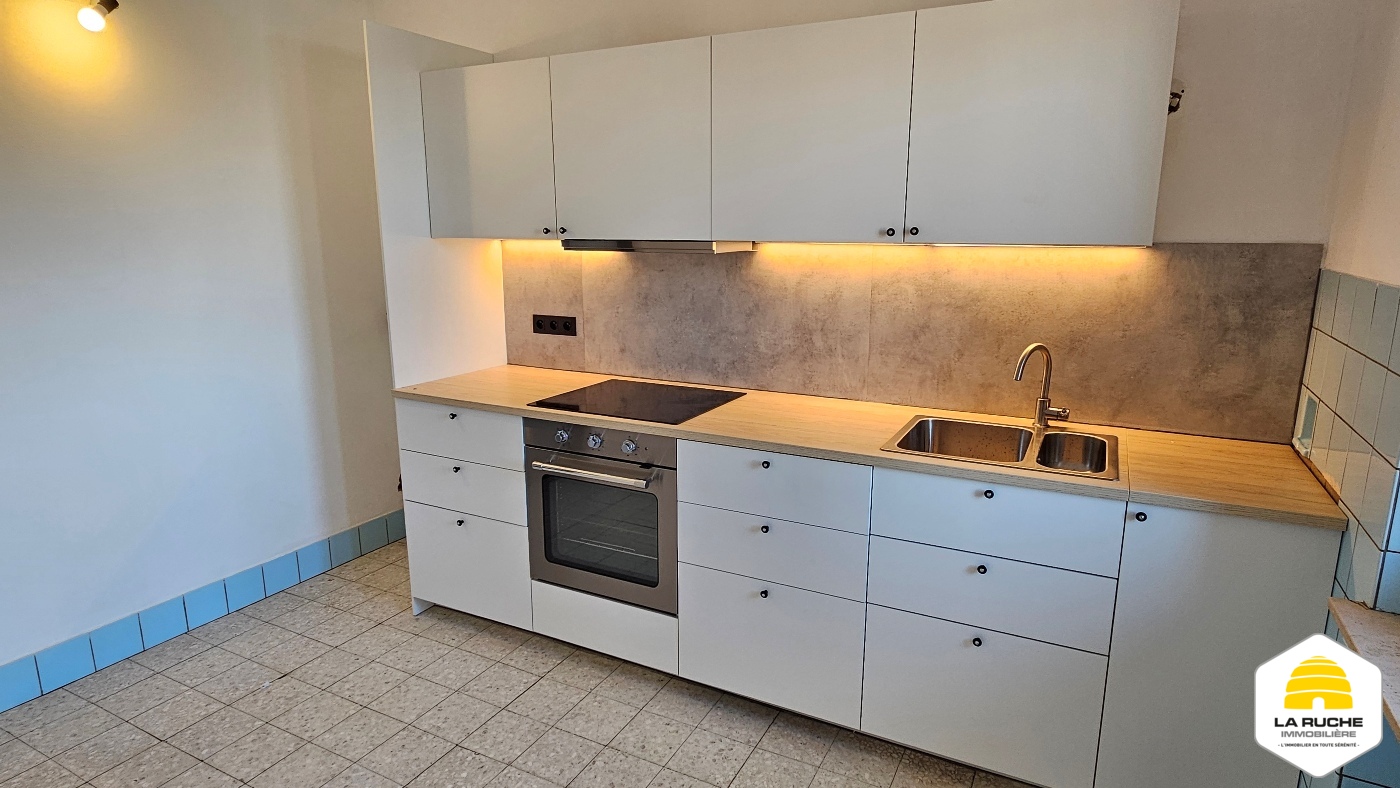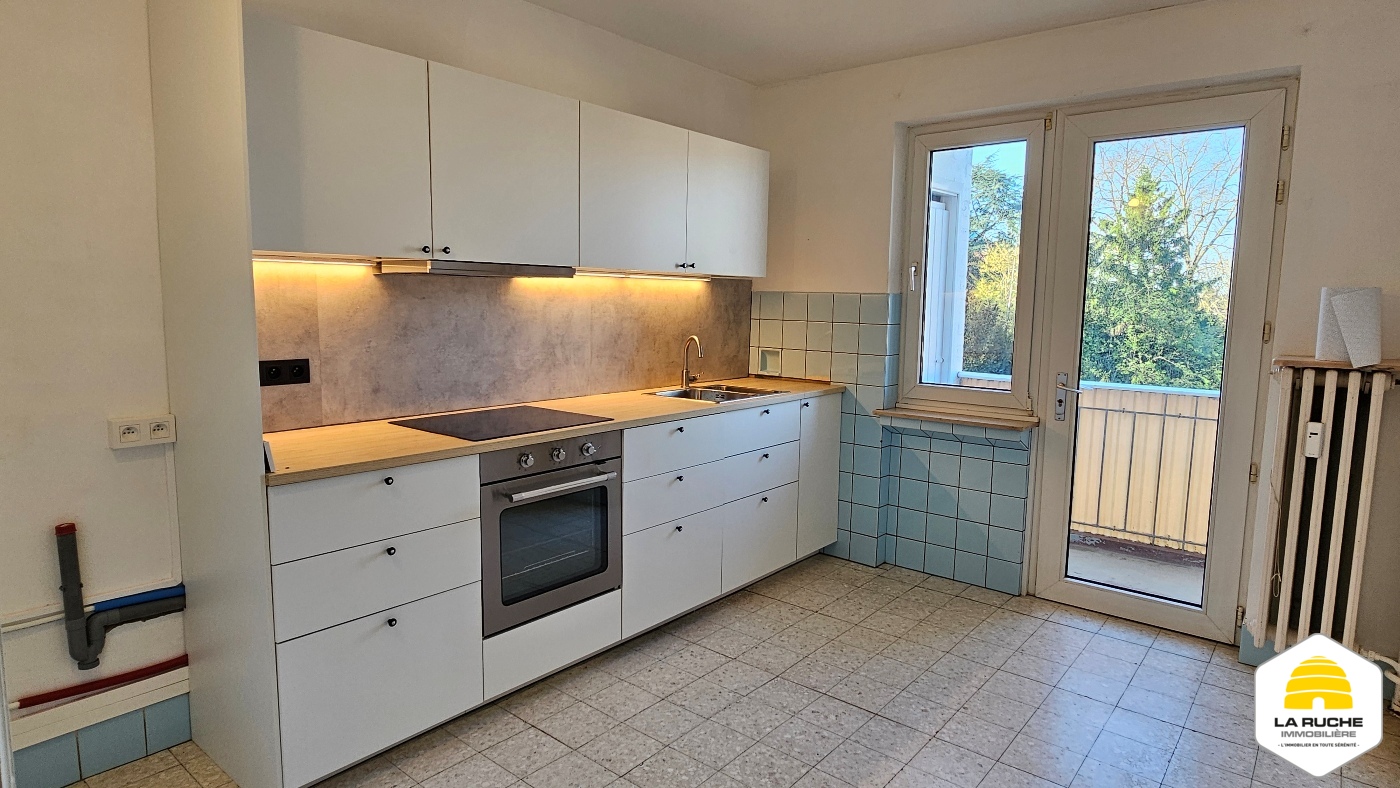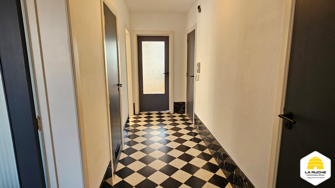 Hall d’entrée (6m²), séjour lumineux (32m²), nouvelle cuisine équipée avec accès balcon (10m²/four, taques, hotte, lave-vaisselle, frigo, arrivée et évacuation pour machine à laver), balcon (2,5m²/local rangement), chambre (15,5m²), nouvelle SDD (5,5m²/WC, douche italienne, meuble simple évier), débarras (1,4m²).