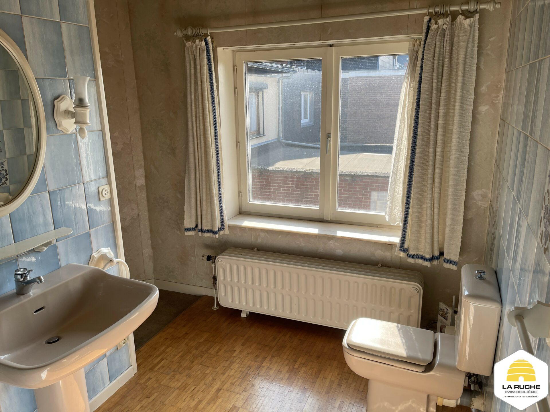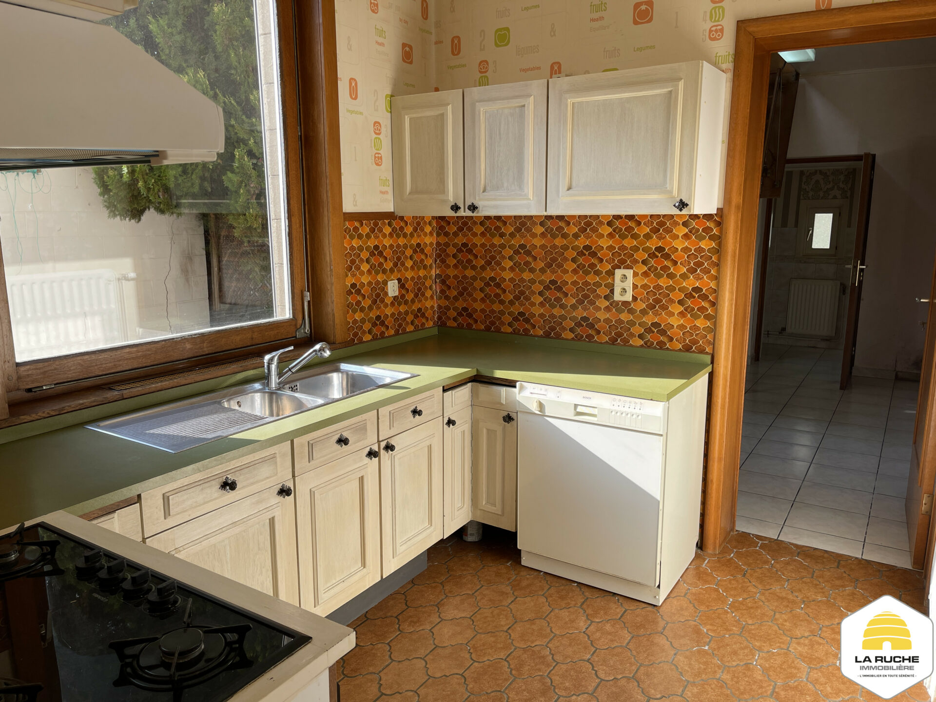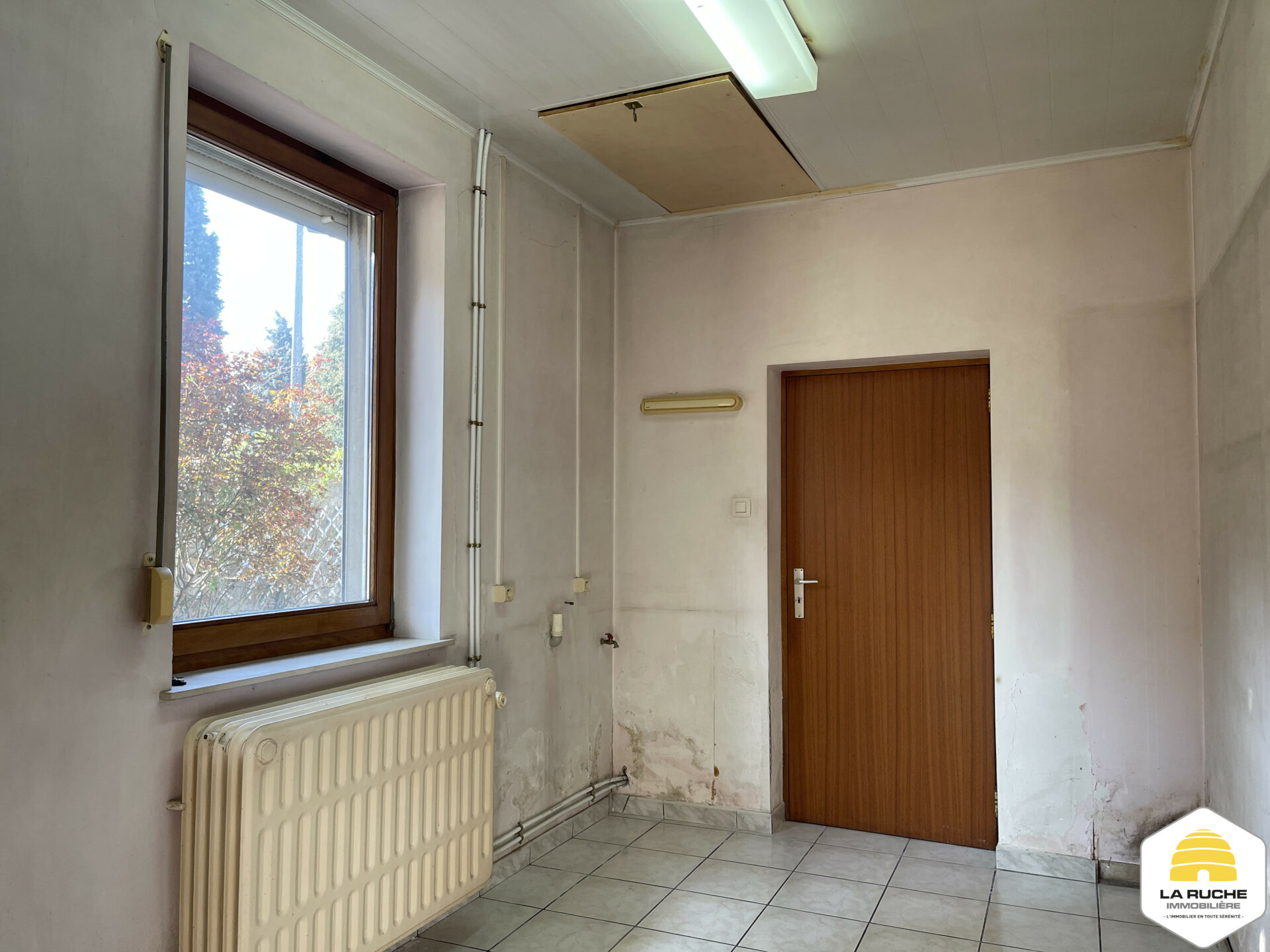 Au rez : hall d’entrée (15m²), vaste séjour (37m²), salle-à-manger (10,5m²), cuisine (7m²/équipements : taques au gaz, four, hotte, lave-vaisselle), buanderie (9m²/accès à un grenier via escalier escamotable d’une superficie de 18m²), WC individuel (2m²/WC classique, meuble et lavabo).