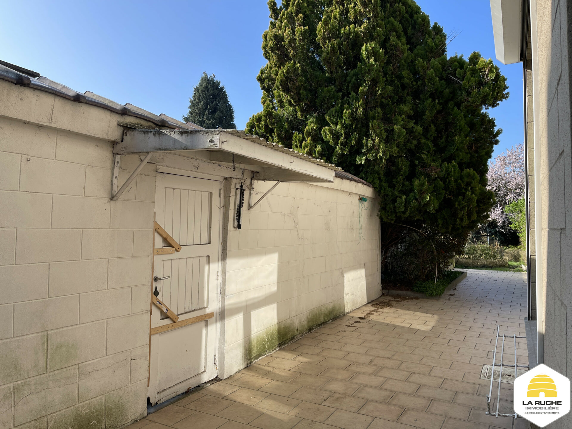 Extérieur : terrasse avec accès au passage latéral et jardin, remise (11m²/châssis en PVC double vitrage)