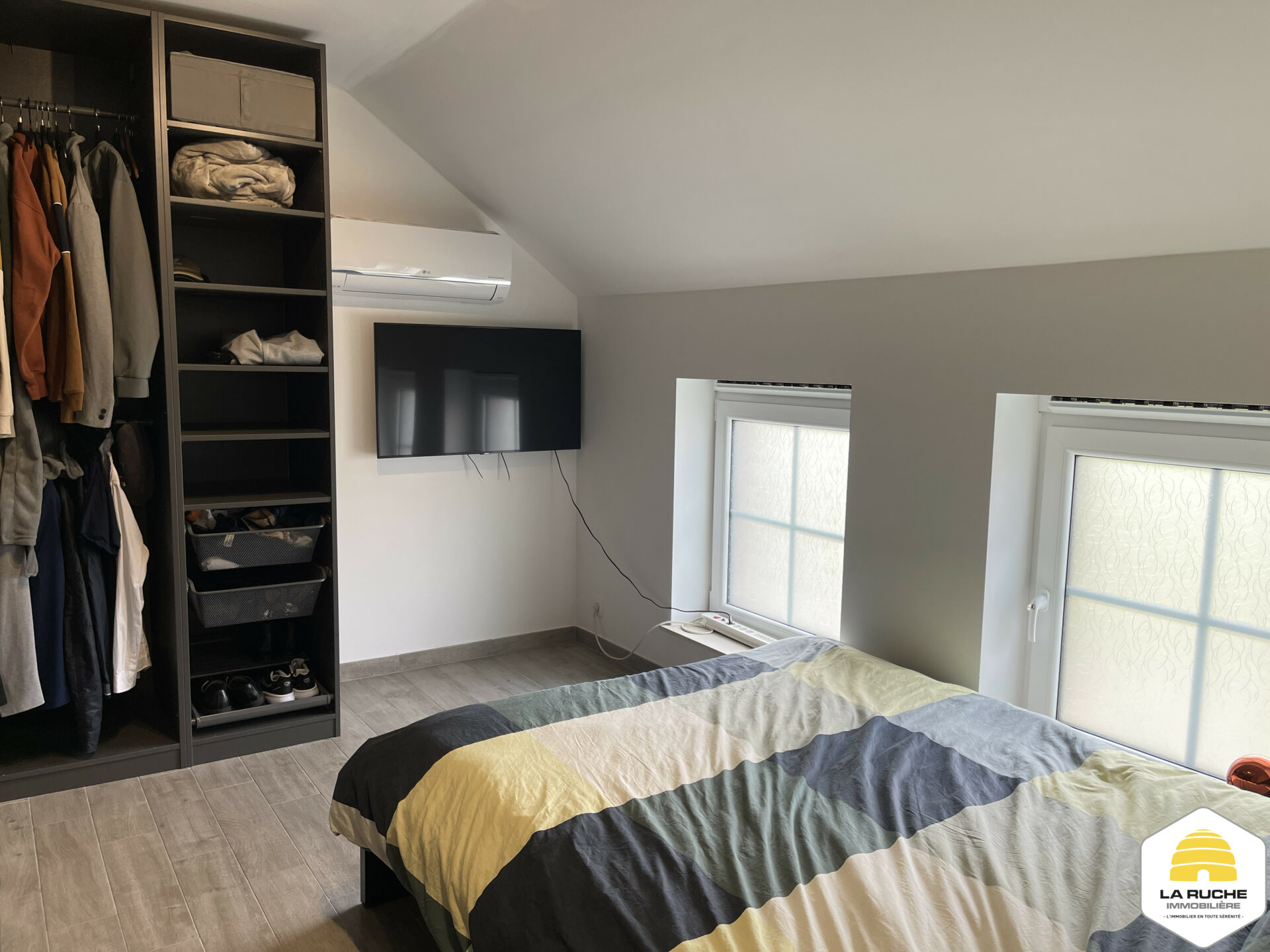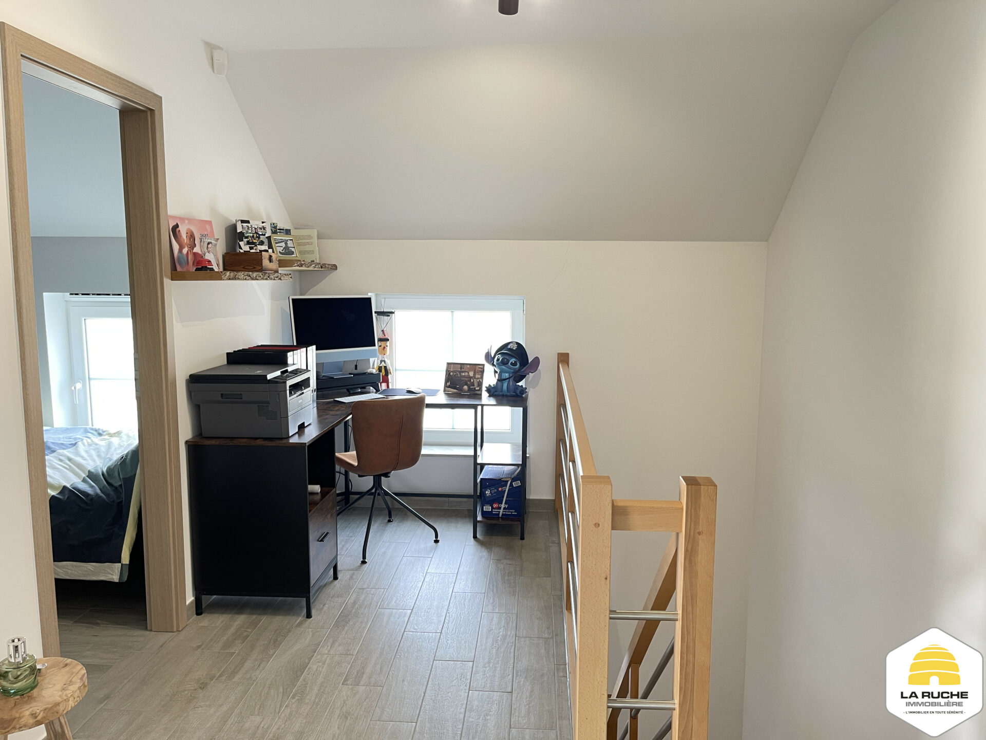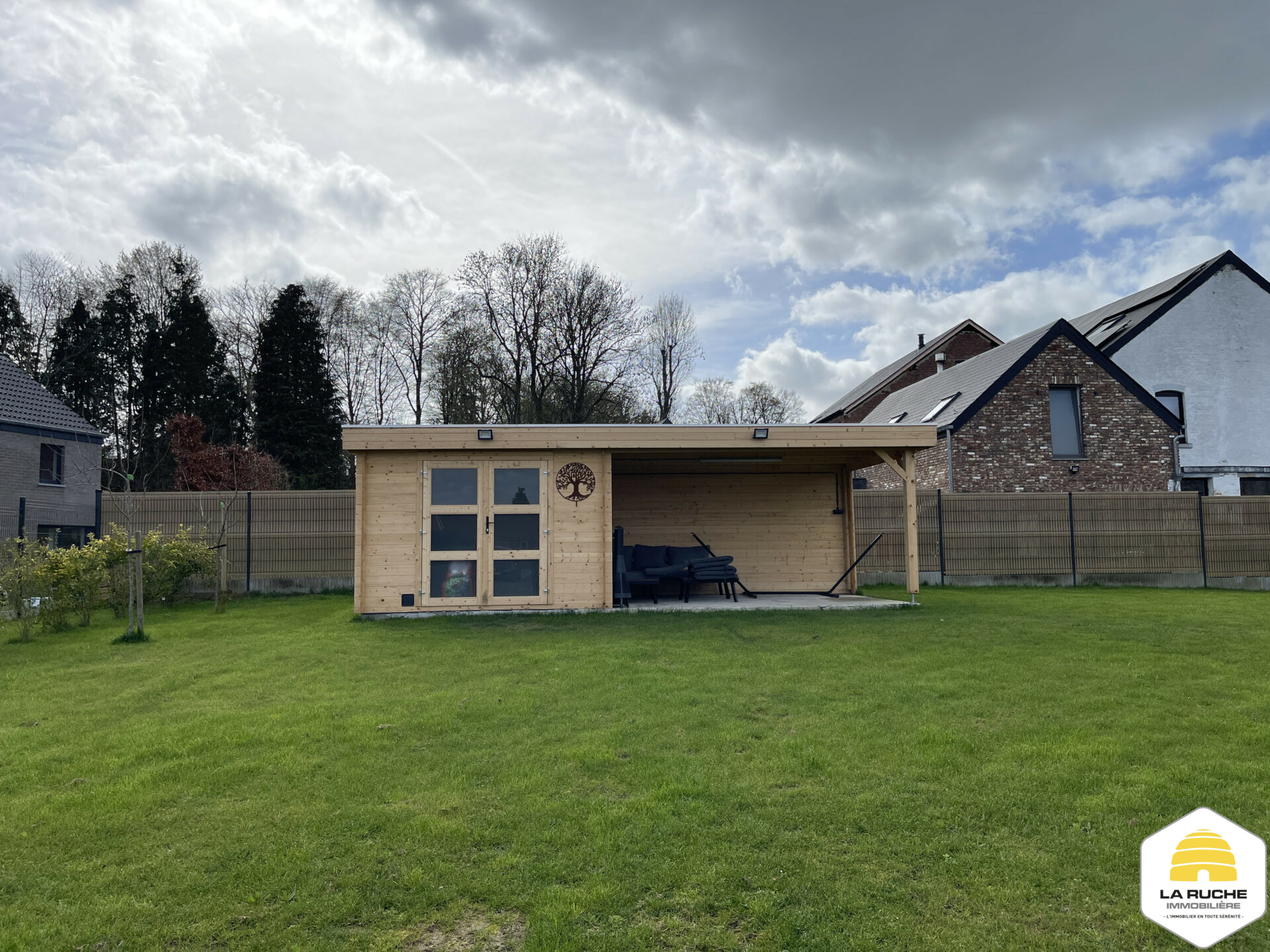À l’extérieur : terrasse en gravier et jardin clôturé orienté Est, abri de jardin de 9m² disposant d’un espace couvert de 12m².