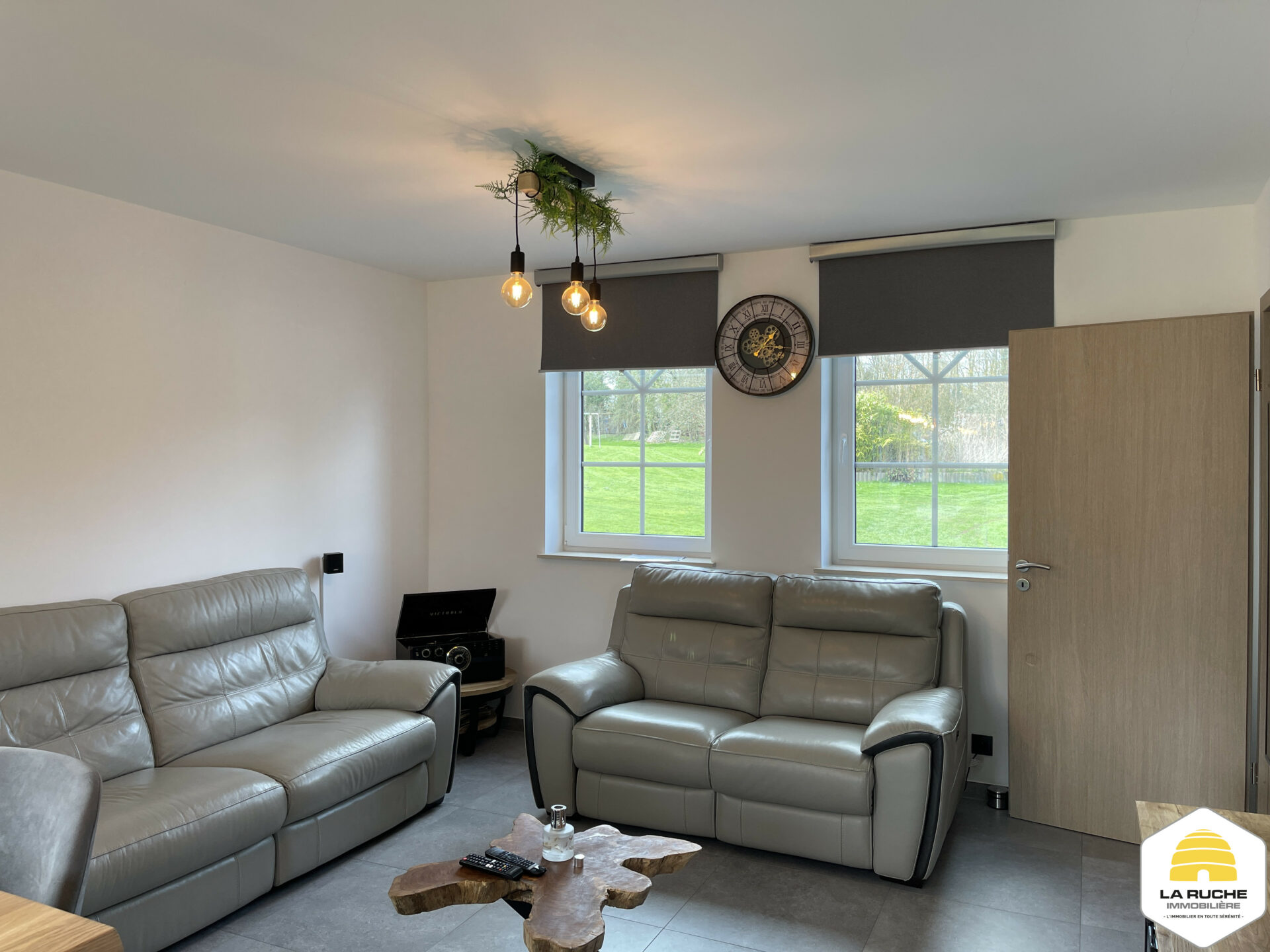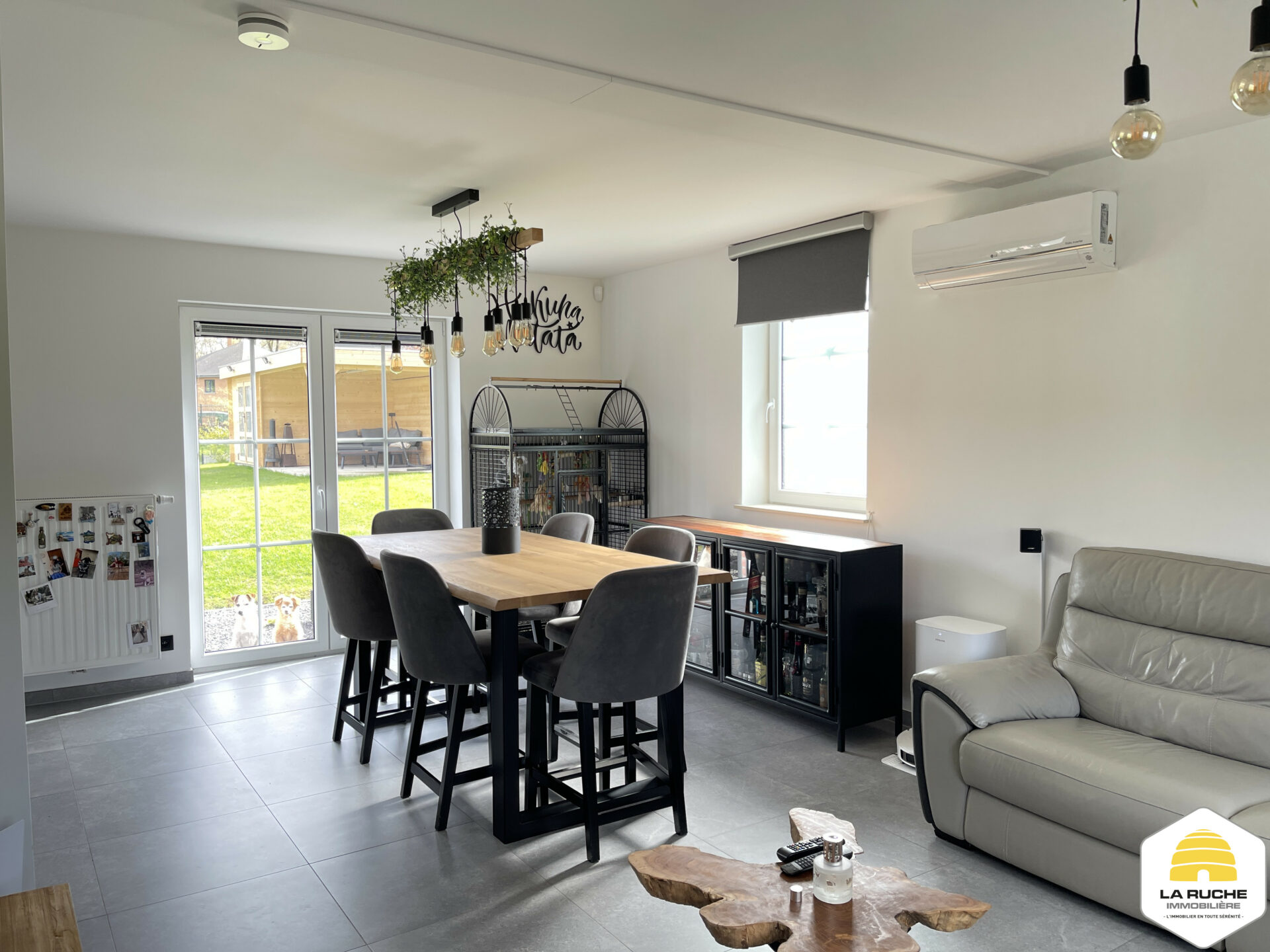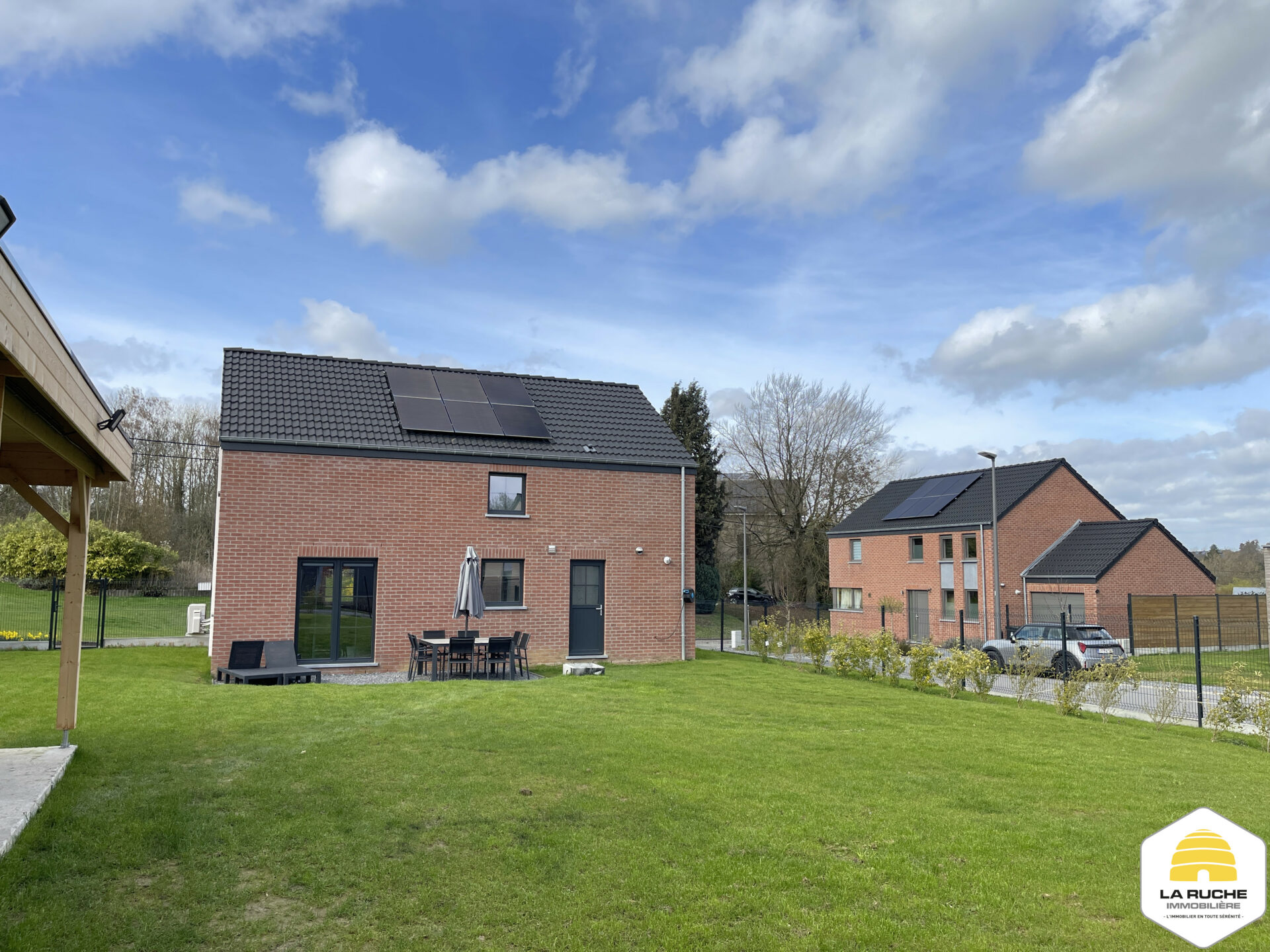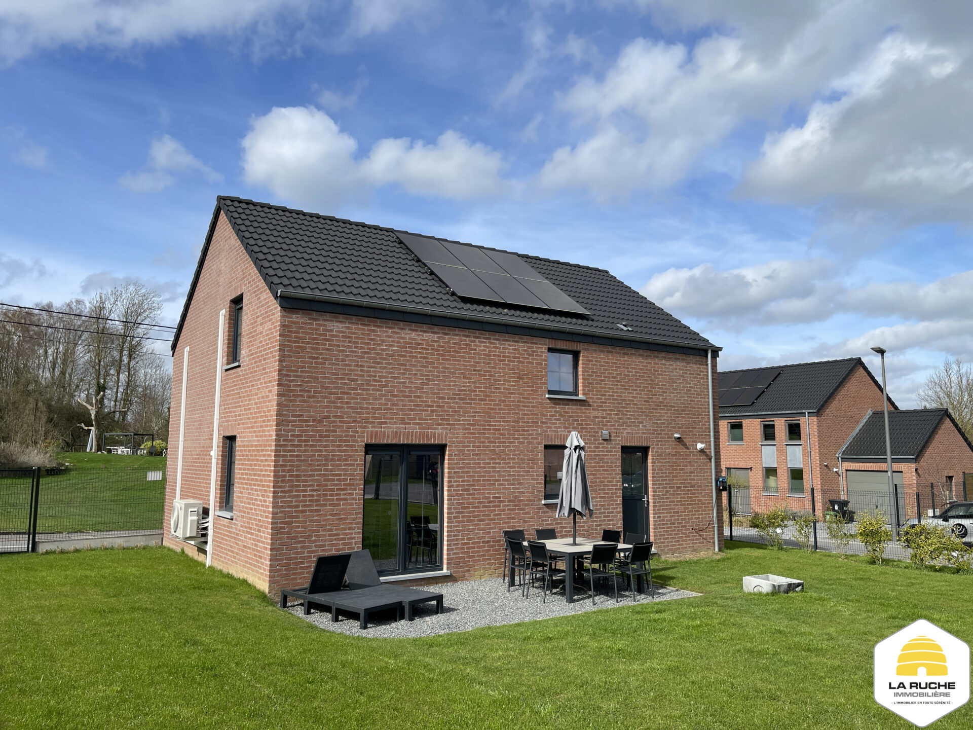 Châssis PVC DV, chauffage central gaz (chaudière à condensation VAILLANT), VMC simple flux, adoucisseur d’eau, cuisine équipée, porte de garage motorisée, climatisation chaud/froid dans le salon et dans les chambres, robot tondeuse, électricité conforme, PEB A, Certibeau.