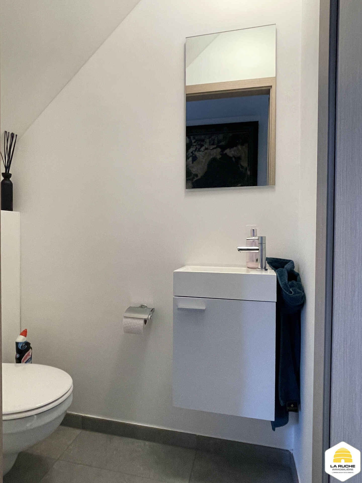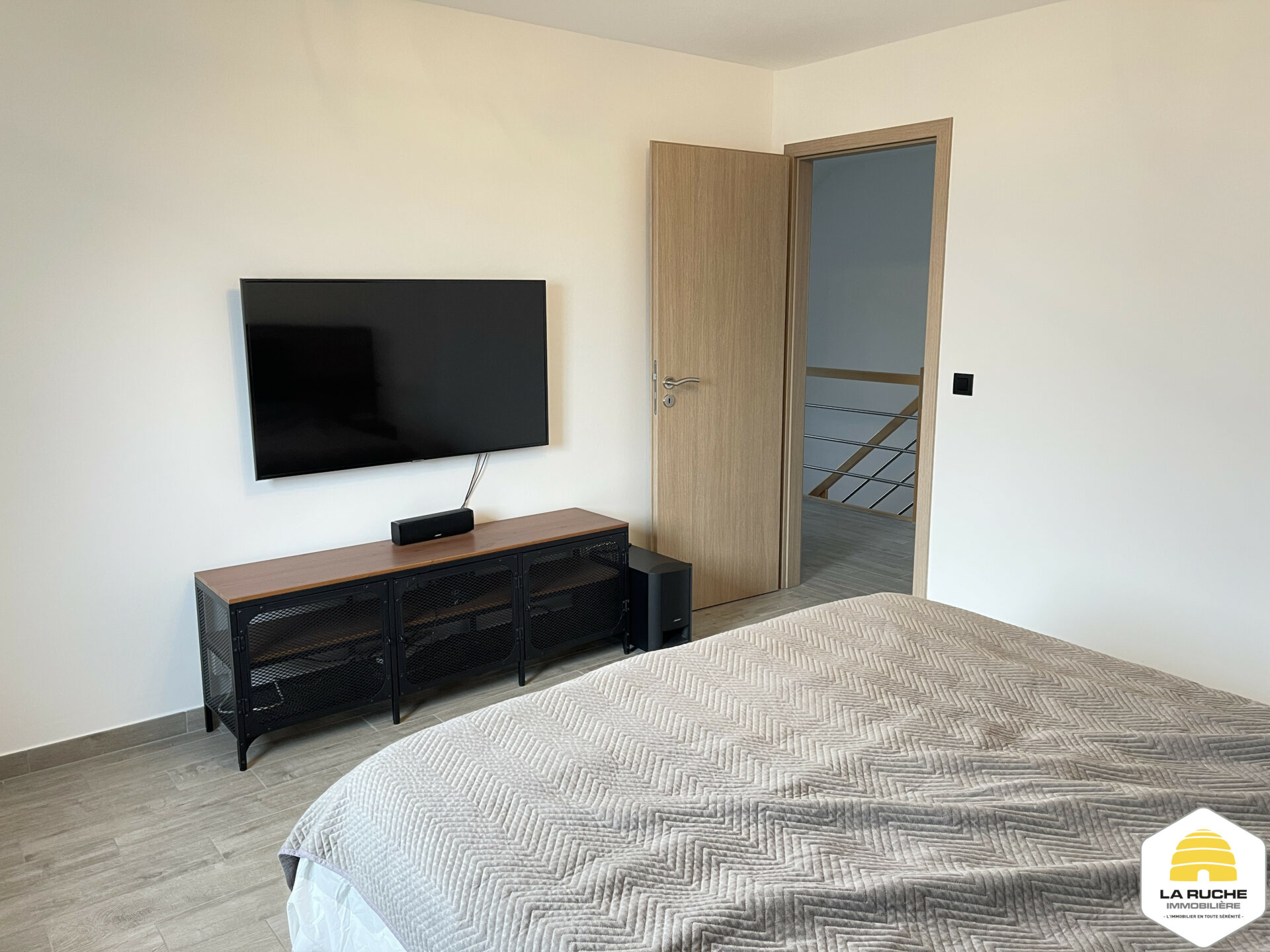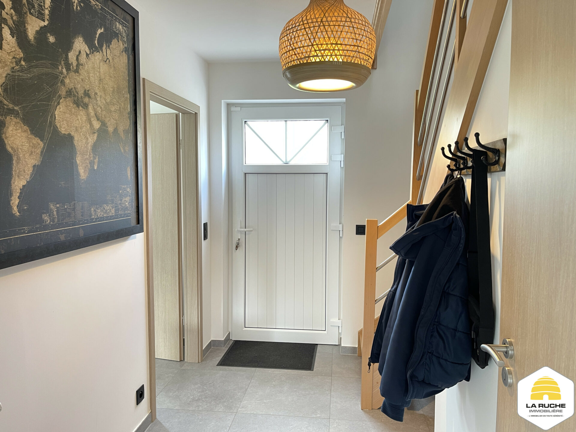 Au rez-de-chaussée : hall d’entrée (5,7m²), logette de toilette (1,13m²/équipements : WC suspendu, lave-mains), séjour (26,73m²/ouvert sur terrasse), cuisine ouverte sur séjour (9,43m²/équipements : taques à induction Samsung, hotte Blaupunkt, frigo encastré, lave-vaisselle, four), garage/buanderie (21,03m²/ouverture sur terrasse/équipements : adoucisseur d’eau au sel, chaudière au gaz à condensation VAILLANT/porte sectionnelle motorisée/garage pouvant accueillir une voiture).
