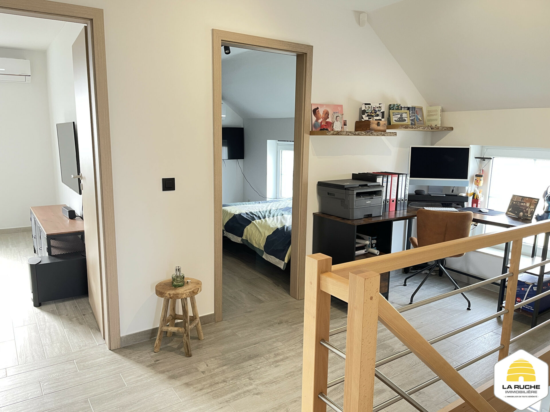 Au 1er étage : palier/hall de nuit (7,88m²), salle de bains (9,72m²/équipements : baignoire, douche à l’italienne, WC suspendu, meuble 1 vasque), 3 chambres (17,06m² comprenant une aménageable en dressing/14m²/11,2m²).