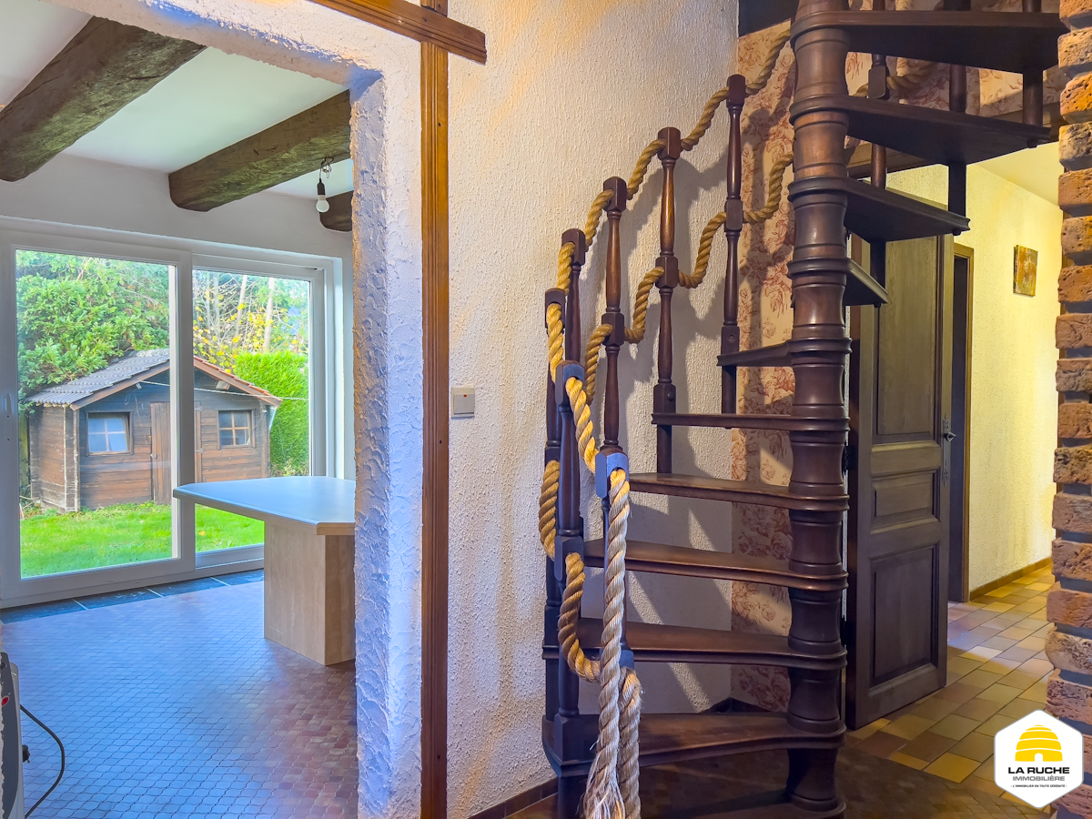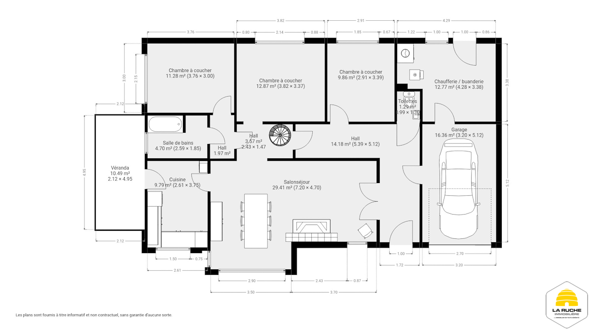 Au rez-de-chaussée : hall d’entrée (14,18 m²), séjour (29,41 m²), cuisine (9,79 m²), salle de bains (4,70 m²), 3 chambres (11,28 m² – 12,87 m² – 9,86 m²), toilette séparée, chaufferie/buanderie (12,77 m²), véranda (10,49 m²) et garage (16,36 m²).