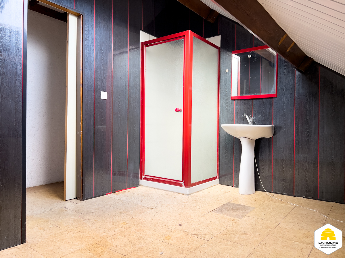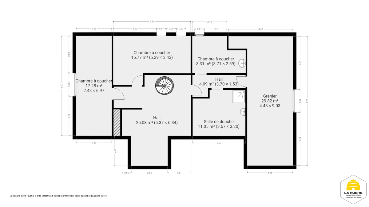 Au 1er étage : hall de nuit/bureau (25,08 m²), 3 chambres (17,28 m² – 15,77 m² – 8,31 m²), salle de douche (11,05 m²) et grenier (29,82 m²).